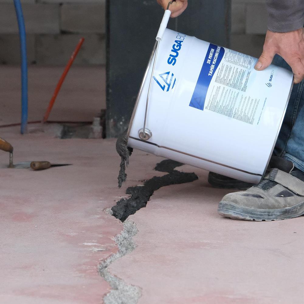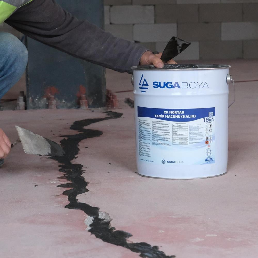 Suga 2K Mortar Tamir Macunu, beton zeminlerdeki çatlak, çukur, kırık ve bozulmuş yüzeylerin onarımında kullanılan, iki bileşenli (15 kg toz + 4 kg sıvı) kalın tip bir tamir harcıdır.