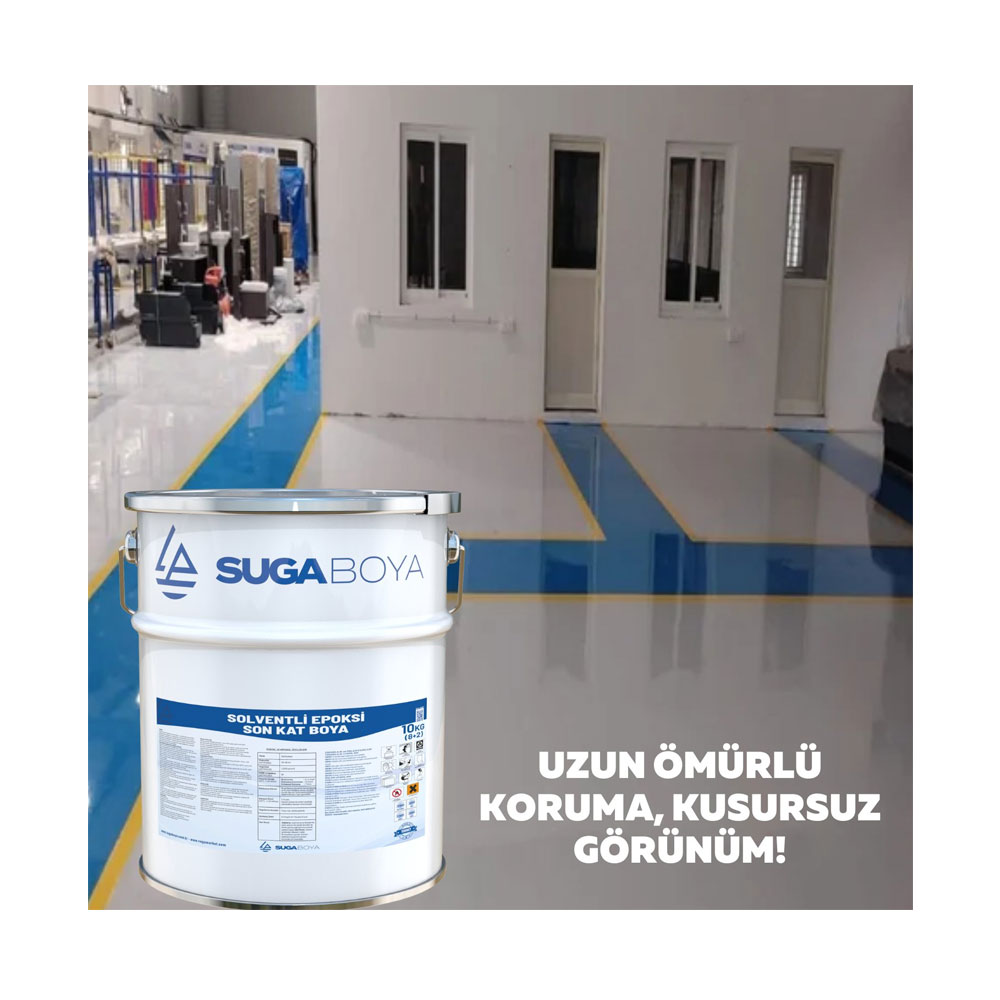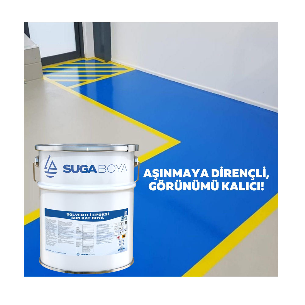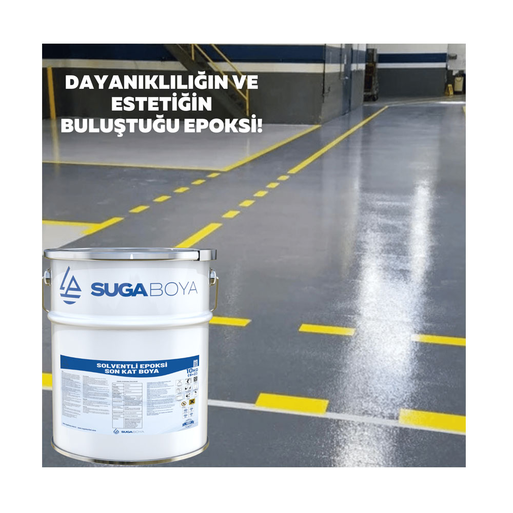 Epoksi son kat boya, zeminlerde yüksek dayanım ve dekoratif görünüm sağlamak amacıyla uygulanan iki bileşenli, solvent bazlı bir boyadır. Suga epoksi boya, endüstriyel zeminlerde yoğun trafiğe ve kimyasal etkilere karşı üstün koruma sunar. 20 kg’lık ambalajı ile geniş alanlarda ekonomik çözümler sağlar. Fabrika, depo, otopark, hangar, atölye gibi alanlarda zemin kaplama sistemi olarak kullanılır. Hem fonksiyonel hem de estetik bir son kat çözümüdür.