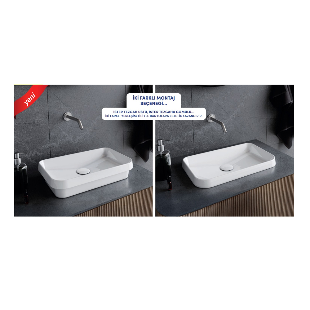 Bu tezgah üstü lavabo hem konut hem de ticari projelerde kullanılmaya uygundur; villa, apartman dairesi, ofis tuvaletleri veya showroom lavabolarında rahatlıkla tercih edilebilir. Modern çizgileri ve kompakt boyutu, minimal tasarım anlayışına sahip banyolarda yer açar. Banyo lavabosu olarak ergonomik derinliği el yıkama, yüz temizliği ve günlük kullanım ihtiyaçlarını karşılayacak şekilde optimize edilmiştir. Tezgah ile birleştiğinde hem görsel bir merkez oluşturur hem de kullanım rahatlığı sağlar. Renk seçimi ve parlak yüzey, banyoya aydınlık bir hava katarak dekorasyonla uyum sağlamayı kolaylaştırır.
