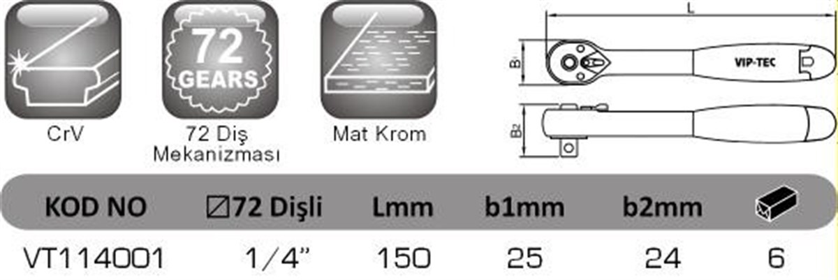 Vip-Tec 1/4'' 72 Diş Profesyonel Cırcır Kolu Vt114001