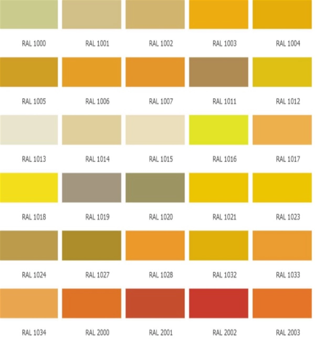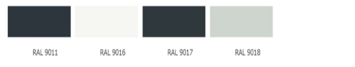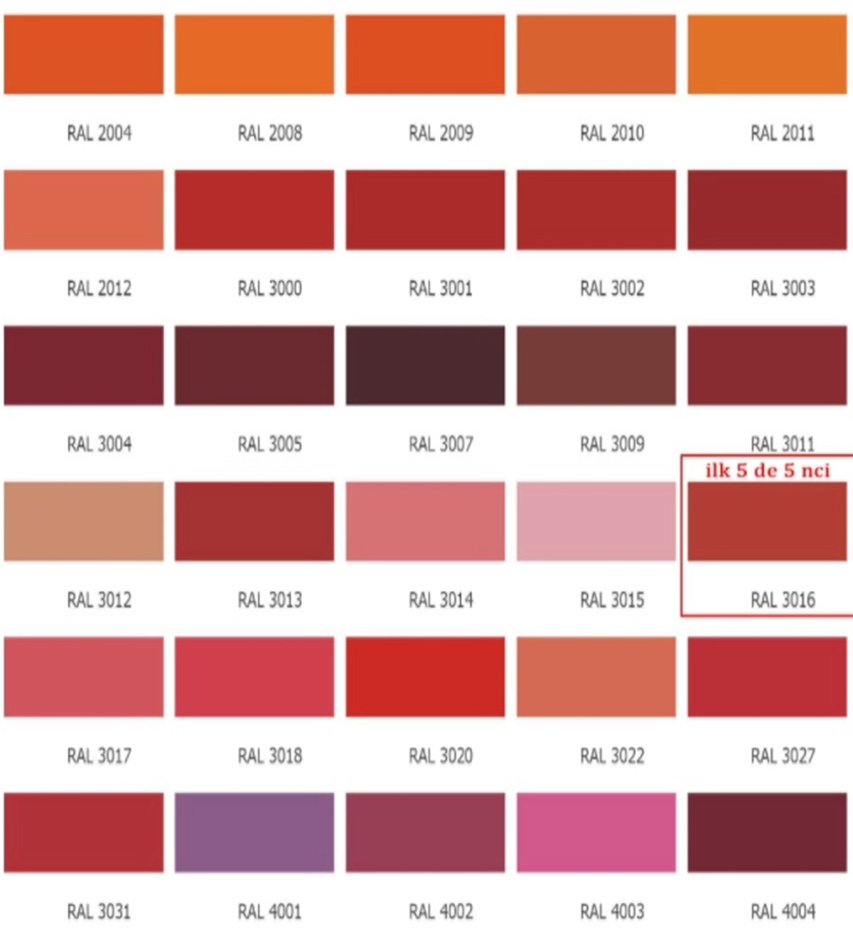 1.Ral 7042 (koyu gri) - 2.Ral 7035 (açık gri) - 3.Ral 6024 (yeşil) 4.Ral 5015 (mavi) - 5.Ral 3016 (kırmızı)